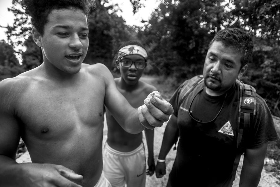 Jimini Smoot, center, laughs while fishing with Jeremiah Twiggs, left, Malachi Smoot, background, and Warren Eanes, right, Thursday, June 27, 2019, near the Castor River in Bollinger County. The boys, all members of the Cape Girardeau-based Honorable Young Men's Club, attended the retreat to learn about teambuilding and natural conservation, as many had grown up in the city and had never been on a similar camping trip before.