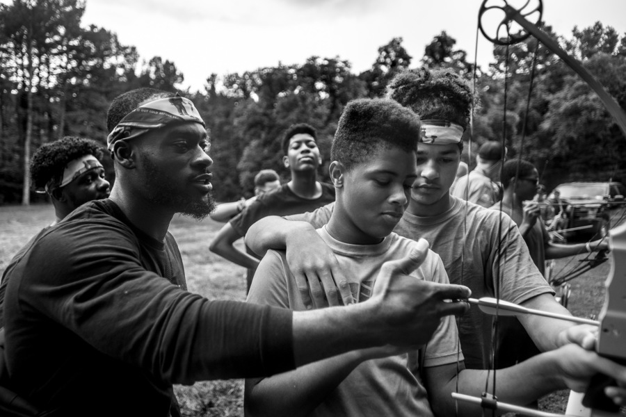 Honorable Young Men's Club co-founder Kweku Arkorful, left, and Keontae Dixon, far right, offer guidance to Malachi Smoot, center, as he tries archery Thursday, June 27, 2019, near the Castor River in Bollinger County. Arkorful, who was born in Ghana and later raised in Chicago, said it was important to him to provide the boys with the opportunity to run and play in nature. "I had a bow when I was young, and we would climb trees and do all of that. I want them to take home a sense of responsibility for nature and help keep their families and friends honest, you know, when it comes to picking up trash, but more than that, I want them to be boys and have fun." The aim of the Honorable Young Men's Club, Arkorful said, is largely based on inculcating a sense of respect in the boys, but he added that self-respect is just as important. Learning new skills and exploring unfamiliar locales, he said, should help facilitate that goal. (Published July 1)