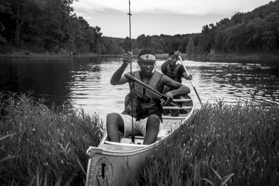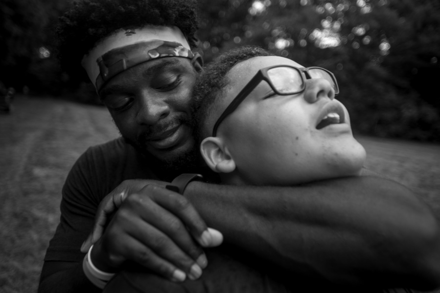 Ketavion Dixon, right, hugs his older brother, Keontae, after the two faced off in the final round of an archery tournament Thursday, June 27, 2019, near the Castor River in Bollinger County. Keontae, 14, beat his younger brother, but as the top two finishers, both boys won rights to sleep in a cabin by the pond instead of camping in a nearby clearing. Most of the Honorable Young Men Club members took to the hiking, fishing and archery with enthusiasm, but were hesitant to actually sleep outdoors, instead preferring the comfort of the cabin. Shortly after the contest, Keontae lost his claim to the cabin on an archery bet with another boy, but when storms rolled in that evening, the whole group ended up sleeping in the cabin. (Published July 1)