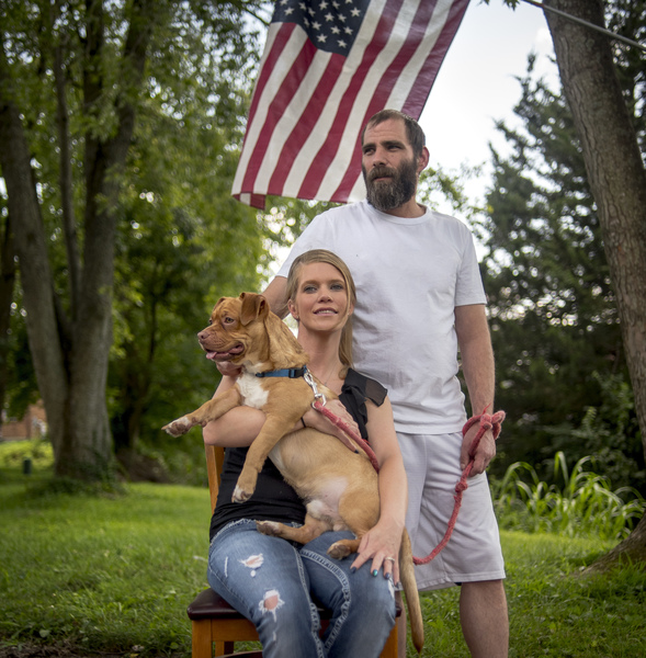 Heather Martin and Wes Orlovski, both of whom are in recovery after experiencing years of opioid addiction, pose for a portrait with their dog, Buddha, Sunday, July 28, 2019, at their home in Cape Girardeau.