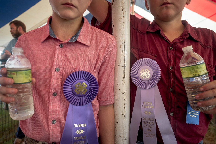 Cousins Conner Wayon Rhodes, 11, left, and Elijah Whitener, 12, are seen while watching other children show sheep on Wednesday, Sept. 11, 2019, at the SEMO District Fairgrounds in Cape Girardeau. Rhodes and Whitener, both of Marquand, Missouri, had shortly before been named champion and reserve champion, respectively, for showing sheep of their own.