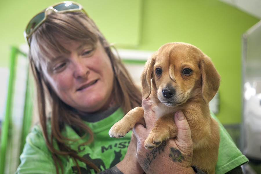 A 10-week-old golden retriever mix puppy with a small tail growing between his eyes, dubbed "Narwhal the Little Magical Furry Unicorn," is seen with Mac's Mission animal rescue founder Rochelle Steffen Wednesday, Nov. 13, 2019, at Mac's Mission in Jackson, Missouri. The puppy's condition has led to widespread online notoriety and Steffen said, despite a flood of adoption offers, she plans to keep Narwhal as her own and possibly train him as a service dog.