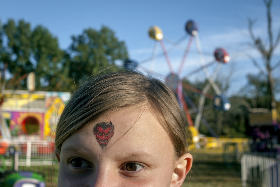 A temporary tattoo depicting the Chaffee Red Devil (the local high school mascot) is seen on the forehead of Jazmine Sadler during Chaffee German Days Saturday, Oct. 12, 2019, at Frisco Park in Chaffee.