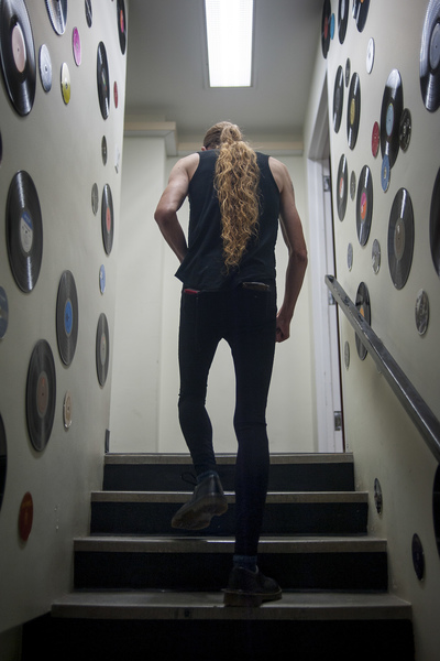 Kirby Ray's signature ponytail and black clothing are seen as he climbs a staircase at River Radio 99.3 Real Rock Friday, Oct. 18, 2019, at River Radio in Cape Girardeau. Ray began growing his hair out more than two decades ago after realizing he didn't need to maintain a conservative cut to operate professionally in radio.