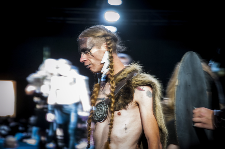 Dressed in Norse-inspired fashion, Kirby Ray, center, waits in the wings a with fellow model (and percussionist with Ray's band, Emaciation) Brodie Silla, left, during the VintageNOW fashion show Saturday, Oct. 19, 2019, at the Show Me Center in Cape Girardeau. Though not a professional model, Ray said he was eager to help the fashion show since proceeds went to help the Safe House for Women, and he has grown to love community involvement through his various charity work at the radio station. "It's an honor to be a part of [this event]," he said. "I think a lot of us are just happy to be able to help out."