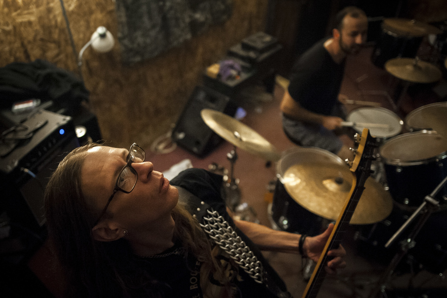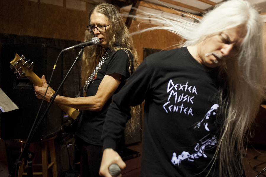 "This is a no-drama environment," Kirby Ray said, twisting an earplug into place and shaking his hair out of its ponytail. "This is a place where we can all just relax and make music." Ray, left, rehearses with guest vocalist Brant Hutchcraft, right, of the band Cycle of Ruin, during band practice with Ray's band Emaciation, Sunday, Oct. 20, 2019, at a shed owned by Ray's friend, Kev Steger in Cape Girardeau.