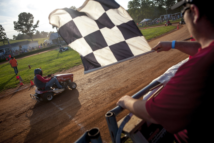 A racer runs his lawnmower across the finish line during a heat race on Saturday, Aug. 10, 2019, at the Patton Saddle Club in Patton, Missouri. Many racers in the top tier swear that with about $10,000 in aftermarket modifications and a competent driver, a lawnmower can do highway speeds on the track. Wayne Goodwin, septuagenarian member of the Old Farts Racing Team, said that even though the only prize is a $7 plaque, racers pour money and time into their vehicles and risk serious bodily harm to win. "Because there's just nothin' like it," Goodwin said. "I'll never quit."