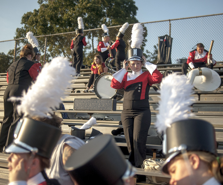 Rebekah Myers, center, adjusts her cap while preparing to perform with the Meadow Heights band during the seventy-fifth-annual Jackson Marching Band Festival Tuesday, Oct. 1, 2019, at the Pit in Jackson.