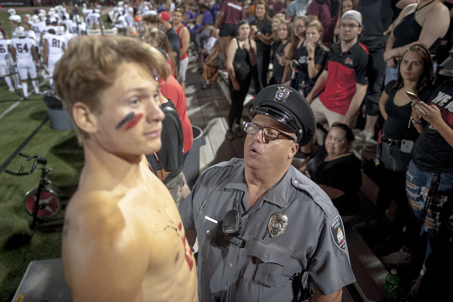 "Rowdy Crowd" student section leader Aidan Gremminger is reprimanded by a member of campus security after leading a cheer from a railing in the stands during the Southeast Missouri State University home opener against Southern Illinois University on Thursday, Aug. 29, 2019, at Houck Stadium Cape Girardeau.