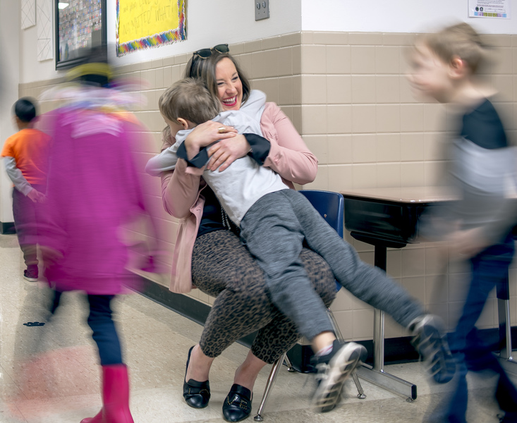 A student leaps into a hug with Jefferson Elementary Principal Leigh Ragsdale between classes Friday, Jan. 18, 2019. In her first year at Jefferson, Ragsdale and her staff are using S.T.E.A.M. curriculum, mindfulness meditation techniques and positive affirmation (including lots of hugs) to improve student outcomes at what has for years been among the school district's most underperforming schools.